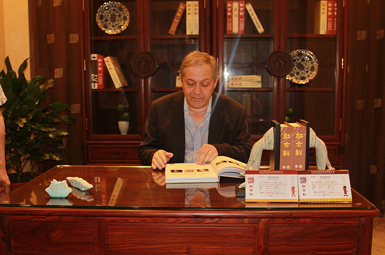 達(dá)瑞爾·斯瓦尼普主席于紅古軒鎮(zhèn)店之寶留影,該作品為廣東省級非物質(zhì)文化珍品