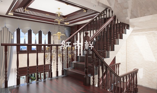 盤旋而上的中西結(jié)合羅馬柱樓梯及紅酸枝材質(zhì)的天然木質(zhì)臺(tái)階讓想象無(wú)限延展......