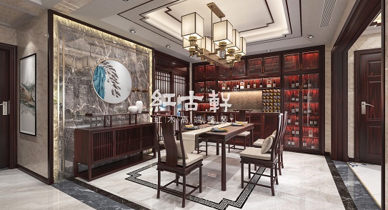 明式家具洗練的造型搭配中式吊頂、中式櫥柜等整個(gè)空間既有“把酒言歡”的灑脫之美又不乏中式審美意趣