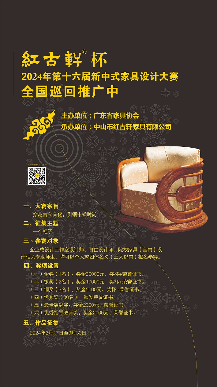 此時(shí)此刻,我們誠摯地向全國各地的設(shè)計(jì)師、設(shè)計(jì)學(xué)子及愛好者發(fā)出邀請:無論您身在何處,只要您熱愛設(shè)計(jì)、敢于創(chuàng)新,誠邀您加入這場設(shè)計(jì)盛宴,一同探索新中式家具設(shè)計(jì)的無限可能,用設(shè)計(jì)改變生活,用創(chuàng)意點(diǎn)亮未來。紅古軒杯,期待與您一起看見更時(shí)尚的中國!