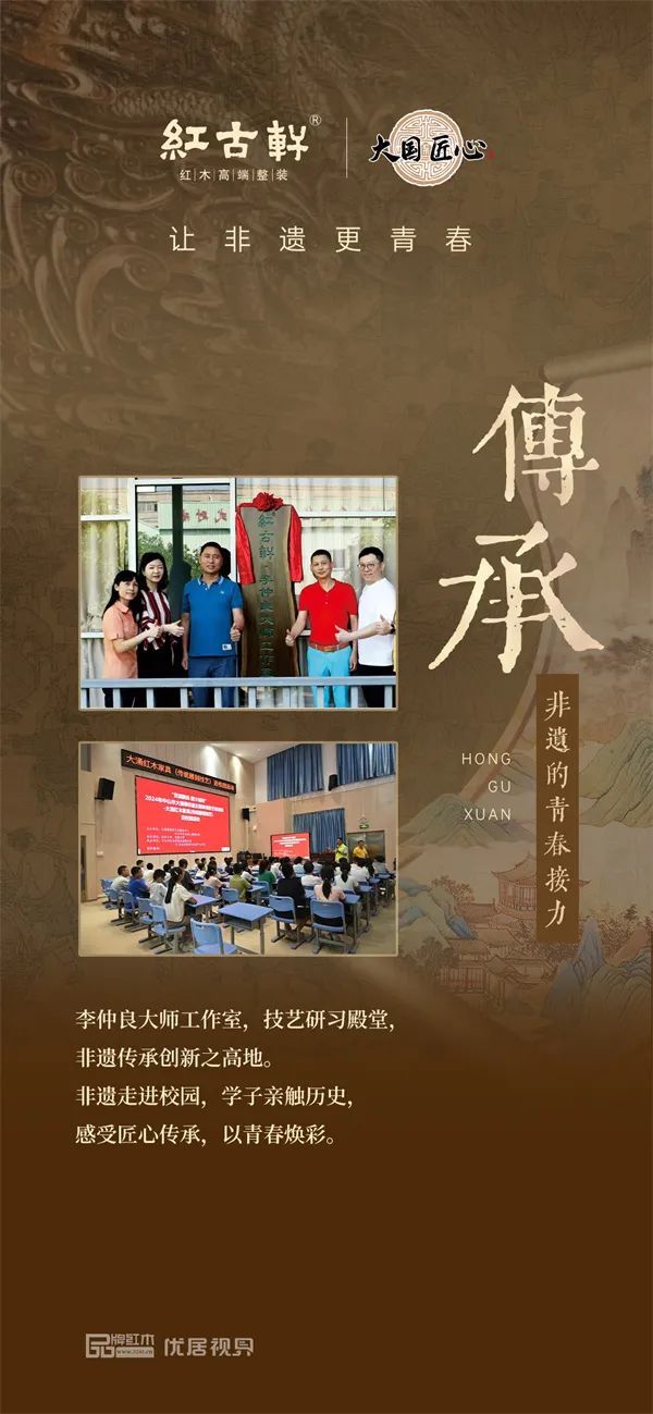 傳世工程,作為文化復(fù)興戰(zhàn)略的重要組成部分,肩負(fù)著激活并傳承千年匠心精神的崇高使命。作為廣東省省級(jí)非物質(zhì)文化遺產(chǎn)大涌紅木家具傳統(tǒng)雕刻技藝傳承基地和廣東省非物質(zhì)文化遺產(chǎn)生態(tài)性保護(hù)示范基地,紅古軒將繼續(xù)將技藝的保護(hù)與傳承視為己任,助力傳世工程。
