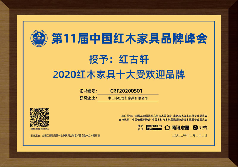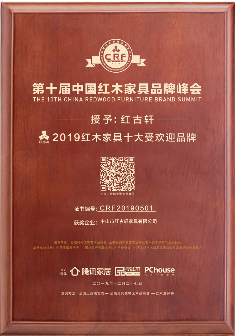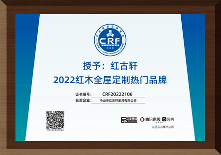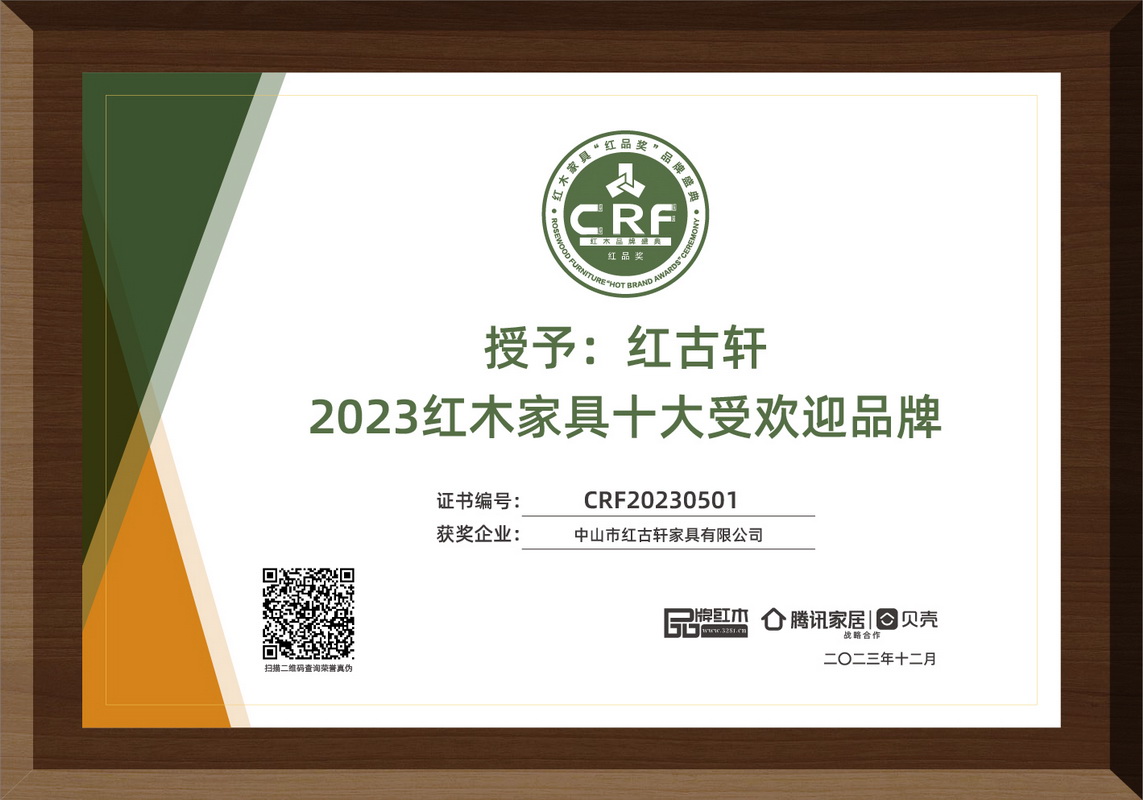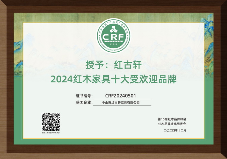 2024紅木整裝定制熱門品牌 2024紅木家具十大受歡迎品牌 紅木品牌峰會15周年特別貢獻人物 2024紅木家具杰出職業(yè)經(jīng)理人 2023年12月,紅古軒品牌創(chuàng)始人吳赤宇獲評“2023紅木家具特別貢獻成就人物” 2023年12月,紅古軒連續(xù)14年榮獲“紅木家具十大受歡迎品牌” 2023年12月,紅古軒紅木高端整裝榮獲“2023紅木全屋定制熱門品牌” 2022年12月,紅古軒連續(xù)13年蟬聯(lián)“紅木家具十大受歡迎品牌” 2022年12月,紅古軒紅木高端整裝榮獲“2022紅木全屋定制熱門品牌” 2022年8月,紅古軒副總裁李春江連任中山工業(yè)設(shè)計協(xié)會會長 2021年12月 紅古軒連續(xù)12年榮獲“紅木家具十大受歡迎品牌” 2021年9月 紅古軒再次當(dāng)選為“廣東省家具協(xié)會執(zhí)行會長單位” 2020年12月 紅古軒連續(xù)11年榮獲“紅木家具十大受歡迎品牌” 2020年11月 紅古軒多名工匠被授予“中國家具行業(yè)技術(shù)能手” 2020年10月 紅古軒連續(xù)三屆當(dāng)選為“中國家具協(xié)會副理事長單位” 2020年8月 紅古軒《云龍尚荷沙發(fā)》榮獲2020“好好陪伴”之客廳系列精品金匠獎 2019年12月 紅古軒連續(xù)10年榮獲“紅木家具十大受歡迎品牌” 2019年8月 紅古軒《云龍尚品茶臺》榮獲“2019匠心守藝·最受歡迎茶臺精品獎·金鉆獎” 2019年8月 紅古軒副總經(jīng)理李春江榮獲“優(yōu)秀菁英人物” 2019年3月,紅古軒榮升為中山市家具商會永遠名譽會長單位 2019年1月,紅古軒連九年斬獲“中國紅木家具十大受歡迎品牌” 2018年8月,紅古軒溫珍干師傅奪中山市手工木工(高級工)職業(yè)技能競賽金獎 2018年5月,紅古軒副總經(jīng)理李春江先生當(dāng)選為中山市大涌鎮(zhèn)青年企業(yè)家協(xié)會會長 2017年,紅古軒當(dāng)選為“中山市工業(yè)設(shè)計協(xié)會會長單位” 2016年,紅古軒生產(chǎn)廠長李仲良先生被評為“中國傳統(tǒng)工藝大師” 2015年1月,紅古軒當(dāng)選為“廣東省林業(yè)龍頭企業(yè)” 2015年1月,紅古軒作摘獲兩大殊榮——泛家居領(lǐng)域品牌價值十強品牌、泛家居領(lǐng)域創(chuàng)新能力十強企業(yè) 2014年12月,紅古軒獨占鰲頭,摘奪廣東省第七屆“省長杯”工業(yè)設(shè)計大賽家具專項賽一等獎 2014年12月,廣東非遺(大涌紅木家具傳統(tǒng)雕刻技藝)傳承基地掛牌紅古軒 2013年,紅古軒當(dāng)選為“中山市家具商會會長單位” 2013年1月,紅古軒被中國家具協(xié)會評為“中國家具行業(yè)優(yōu)秀企業(yè)” 2012年12月,紅古軒晉升為“國家AAAA級標(biāo)準(zhǔn)化良好行為企業(yè)” 2012年11月,紅古軒獲批成立廣東省博士后創(chuàng)新實踐基地 2012年9月,紅古軒被評為“中國家具設(shè)計引領(lǐng)企業(yè)” 2012年3月,紅古軒于美國芝加哥榮獲家居奧斯卡“2012全球家居gia創(chuàng)新大獎” 2012年,紅古軒榮升為“中國家具協(xié)會副理事長單位” 2012年,紅古當(dāng)選為“廣東省紅木商會會長單位” 2011年11月,被評為“中國家具產(chǎn)業(yè)集群優(yōu)秀企業(yè)” 2011年7月,榮升為“中國林產(chǎn)工業(yè)協(xié)會常務(wù)理事單位” 2011年,紅古軒作為“國禮”制作單位,制作紅木國禮贈予國際奧委會主席羅格,被評為“第十六屆亞洲運動會杰出貢獻單位” 2010年,廣東省質(zhì)量技術(shù)監(jiān)督局授予紅古軒“采用國際標(biāo)準(zhǔn)產(chǎn)品認(rèn)可”證書 2009年至今,紅古軒連續(xù)8年被評為“中國紅木家具十大受歡迎品牌” 2008年,被評定為“廣東省著名商標(biāo)” 2008年,紅古軒被認(rèn)定為“廣東省名牌產(chǎn)品” 2005年,紅古軒被評為“廣東省民營科技企業(yè)” 2002年,紅古軒一舉當(dāng)選全國九運會圣火把桿設(shè)計與制作權(quán) 1997年,源于對于紅木家具的熱愛,紅古軒攜手一群頂級的工匠,正式進入紅木家具行業(yè),創(chuàng)立了紅古軒品牌!
